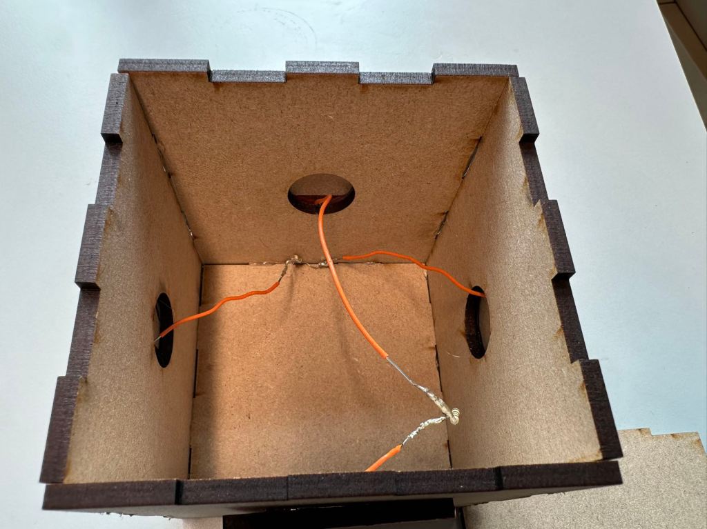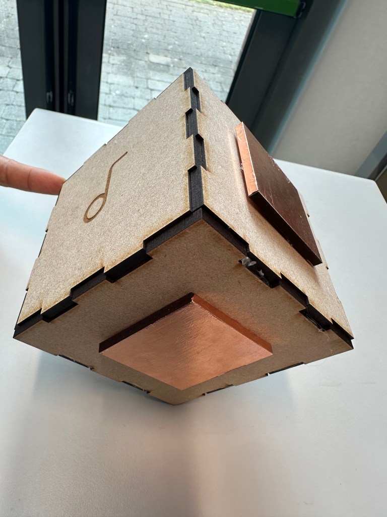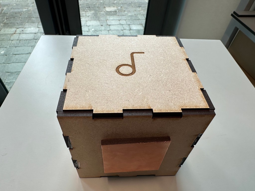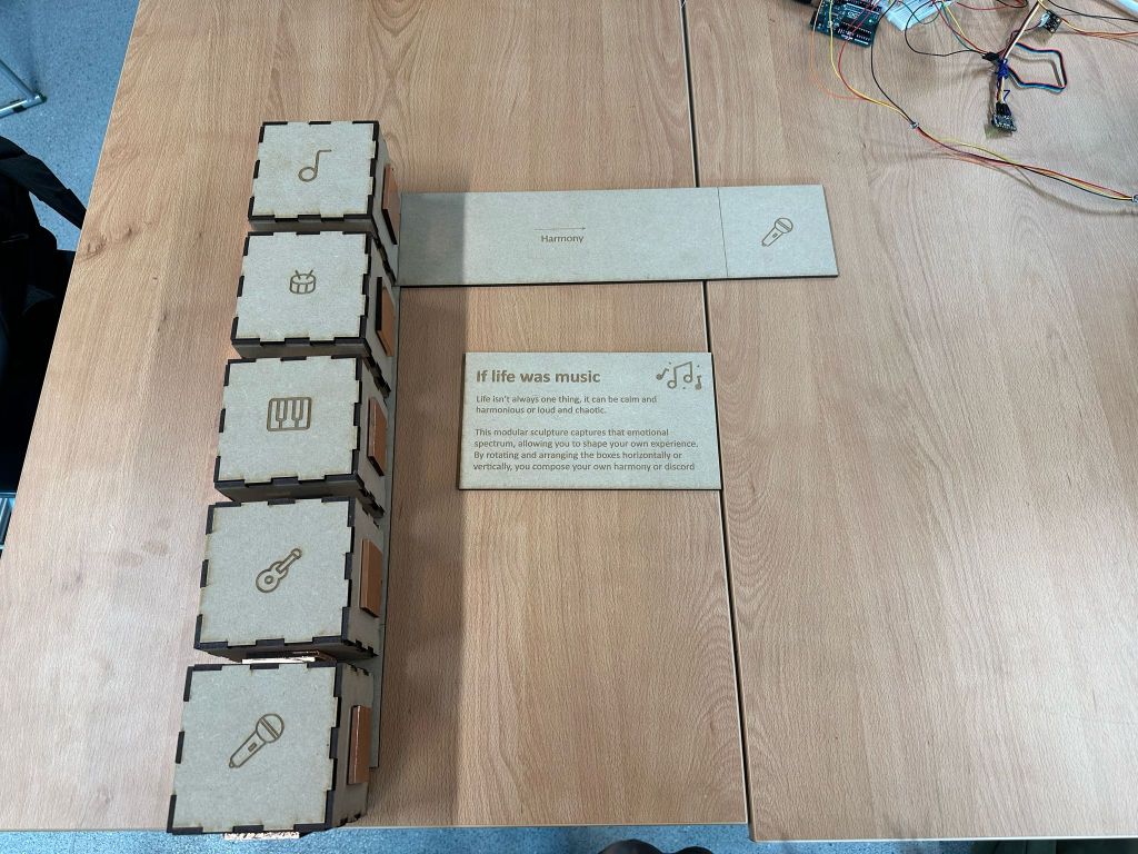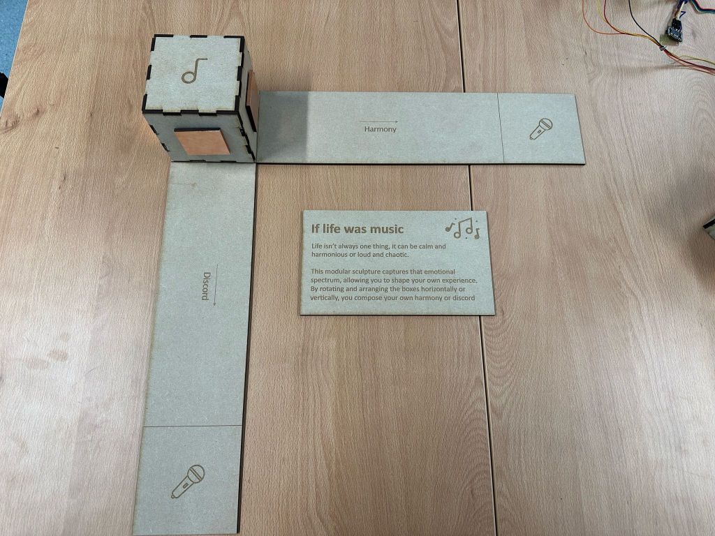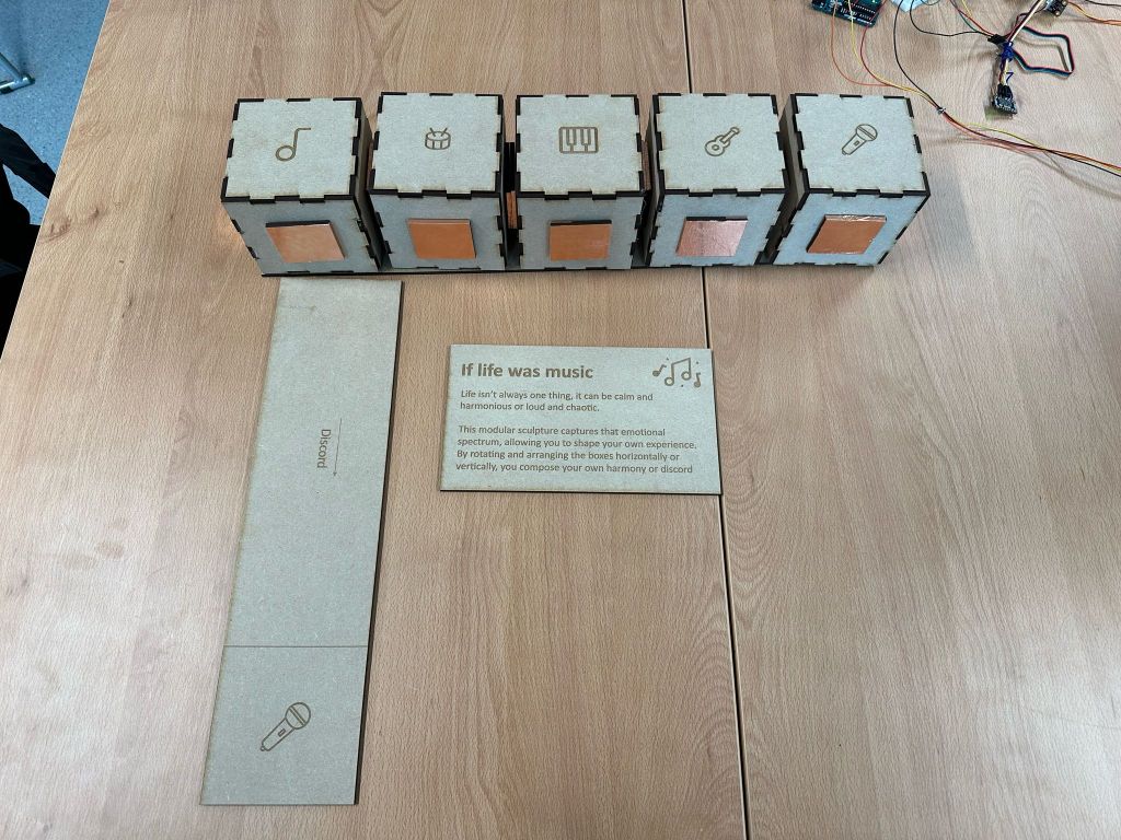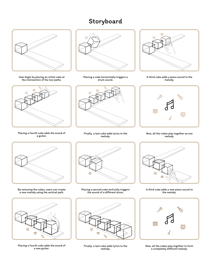 Users can create a melody by assembling the sculpture either horizontally or vertically. The direction they choose determines the tone of the resulting sound. The sculpture is composed of five cubes, each representing a different instrument: drums, piano, guitar, and vocals. The initial cube, which begins silently, marks the starting point of the interaction.